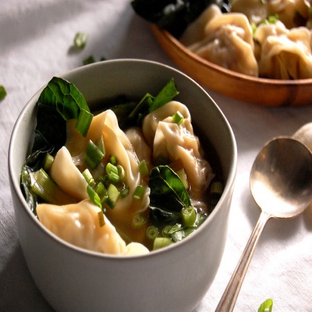 Wheat flour noodles with egg, onions, and fried scallions.